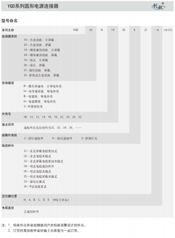 該系列產品符合GJB5371-2005《YGD系列圓形電源連接器通用規范》,其連接方式采用卡口連接,接觸件端接形式為爆接。插孔接觸件為冠簧插孔。產品具有快速連接和分離,耐環境好、可靠性高等特點,適用于大電流電源系列的連接。